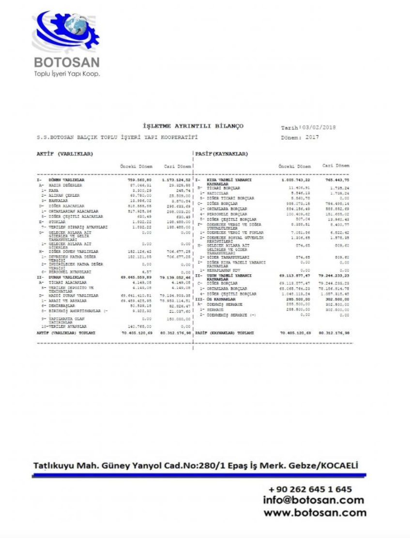2017 YILI İŞLETME AYRINTILI BİLANÇOSU