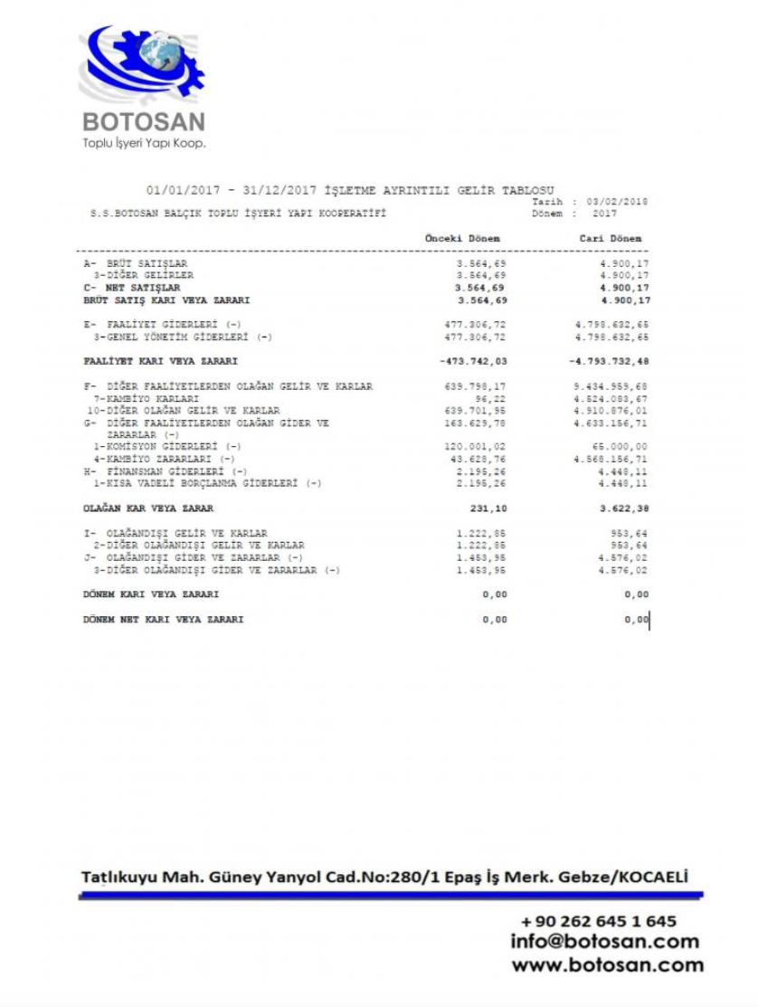 2017 YILI İŞLETME AYRINTILI GELİR TABLOSU