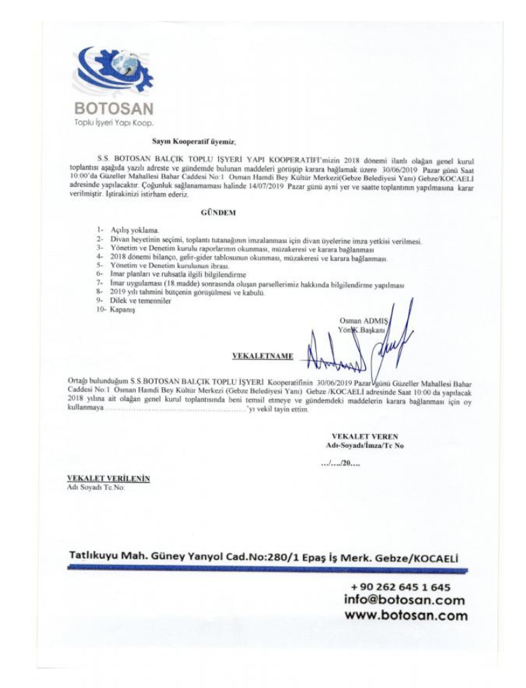 S.S. BOTOSAN BALÇIK TOPLU İŞYERİ YAPI KOOPERATİFİ’mizin 2018 dönemi ilanlı olağan genel kurul toplantısı aşağıda yazılı adreste ve gündemde bulunan maddeleri görüşüp karara bağlamak üzere 30/06/2019 Pazar günü Saat 10:00’dGüzeller Mahallesi Bahar Caddesi No:1 Osman Hamdi Bey Kültür Merkezi(Gebze Belediyesi Yanı) Gebze/KOCAELİ adresinde yapılacaktır. Çoğunluk sağlanamaması halinde 14/07/2019 Pazar günü ayni yer ve saatte toplantının yapılmasına karar verilmiştir.İştirakinizi istirham ederiz.